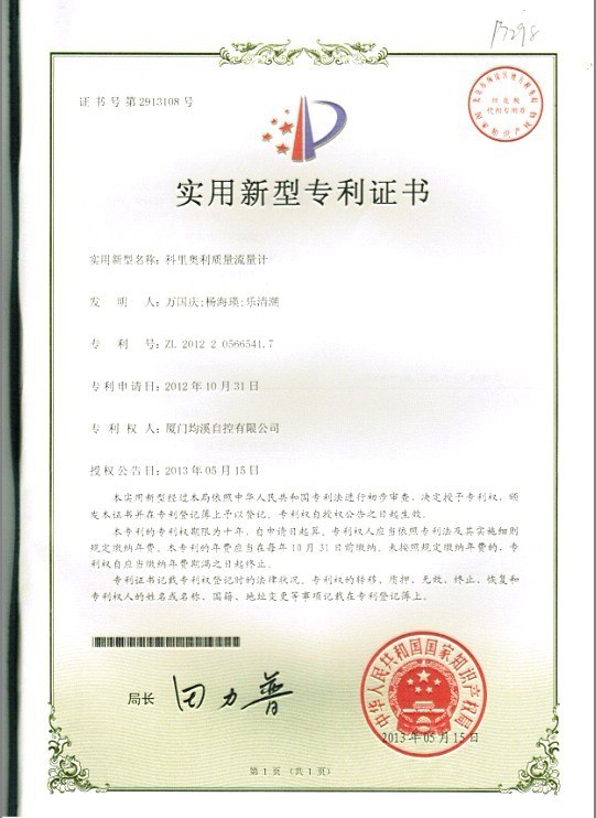 靶式流量計專利證書